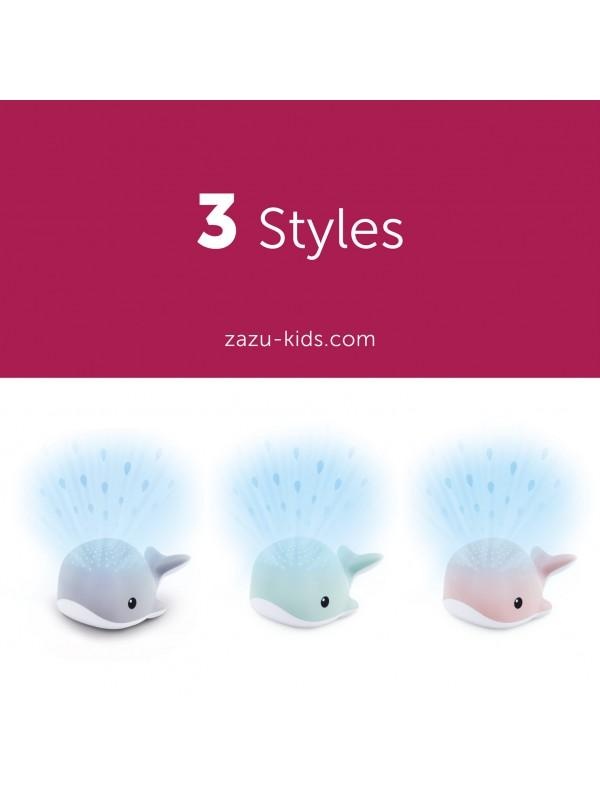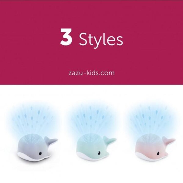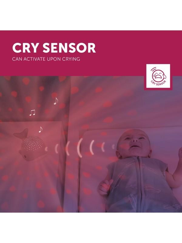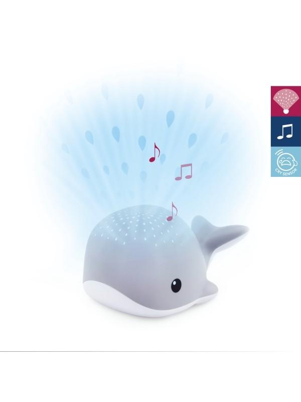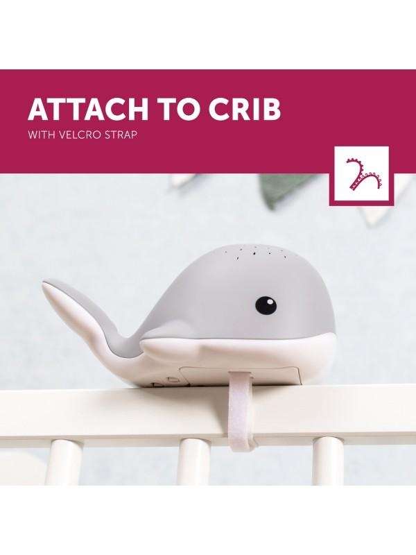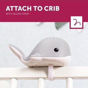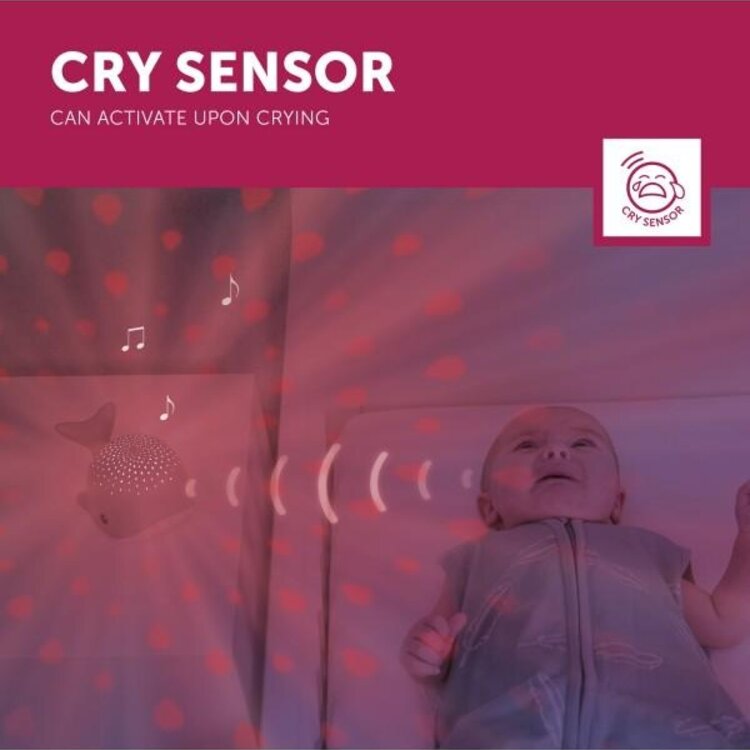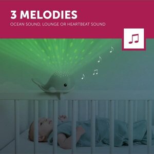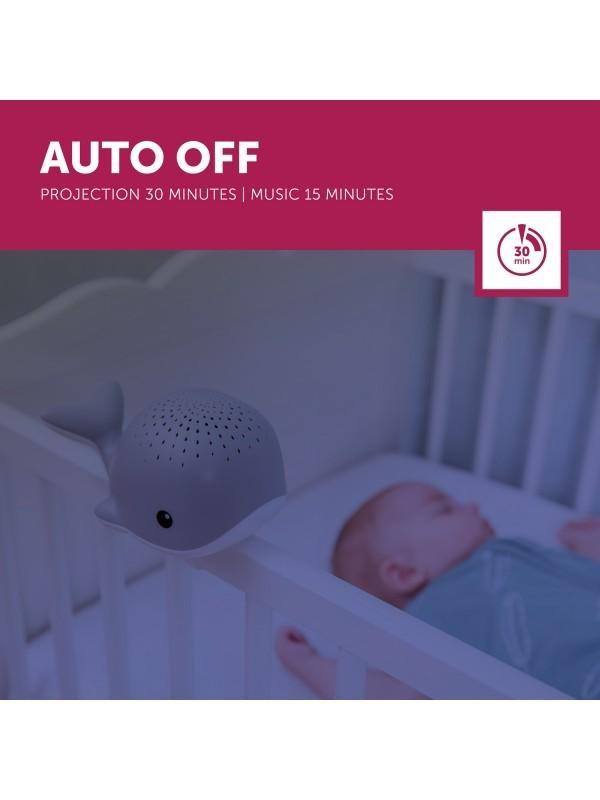 Creëer een magische hemel in de kinderslaapkamer! Wally de walvis zal hectische bedtijdmomenten veranderen in rustige slaapmomenten door het projecteren van waterdruppels op het plafond van de slaapkamer. Ondertussen kunnen er kalmerende oceaangeluiden, hartslaggeluiden of traditionele slaapliedjes afgespeeld worden. De muziek gaat automatisch uit na 15 minuten, de projectie na 30 minuten. Wanneer uw baby begint te huilen, zal de huilsensor de projectie automatisch inschakelen. U kan Wally vastmaken aan het kinderbedje of naast het bed plaatsen.